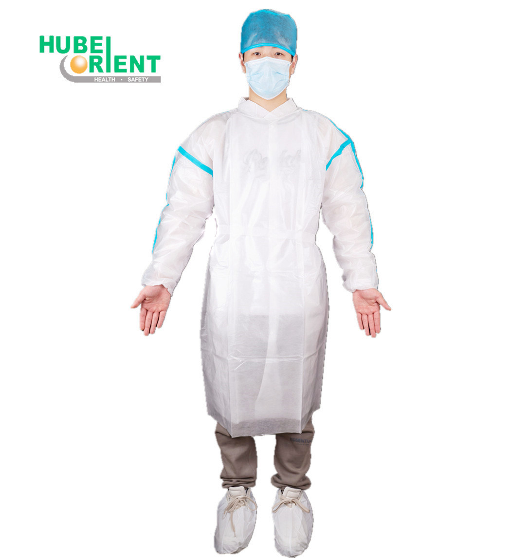 দুর্দান্ত প্রতিরোধের হাসপাতালের ব্যবহার এককালীন পিপি + পিই আইসোলেশন গাউন সিম টেপ সহ